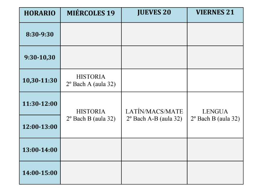 - 1º y 2º Bachillerato y Ciclos Formativos: 14:00 a 15:00